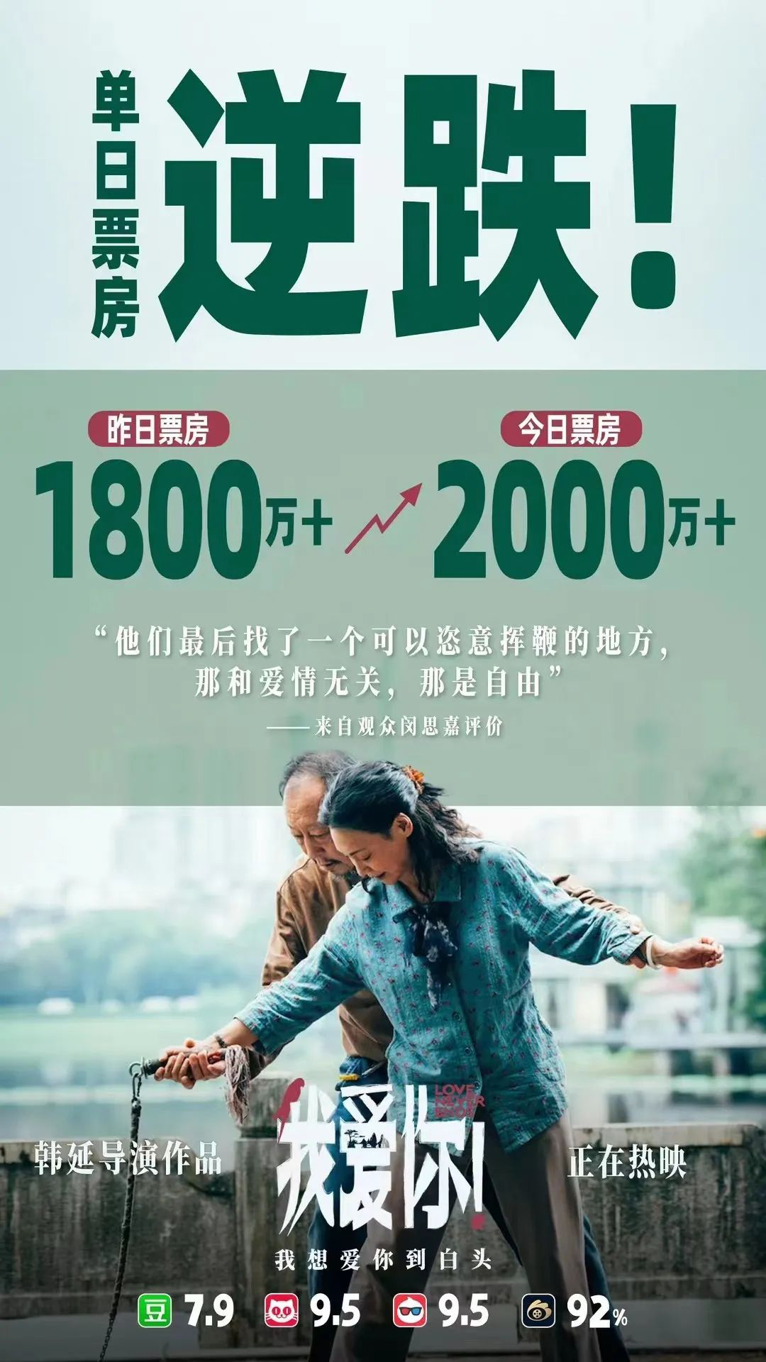 同档期上映的现实题材影片《我爱你!》同样在工作日实现了小幅逆跌,同时连续12日单日过千万,总票房过3亿,如此稳健的票房走势,与出众的口碑脱不开关系。