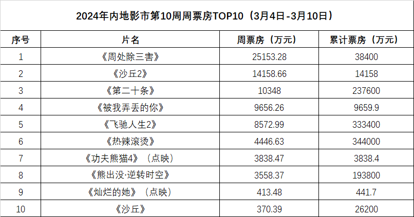 2024年第10周(3月4日至3月10日)中国内地电影市场周票房为8.19亿元。当周市场总出票张数1971.5万张,放映总场次254.6万场,平均票价41.5元。