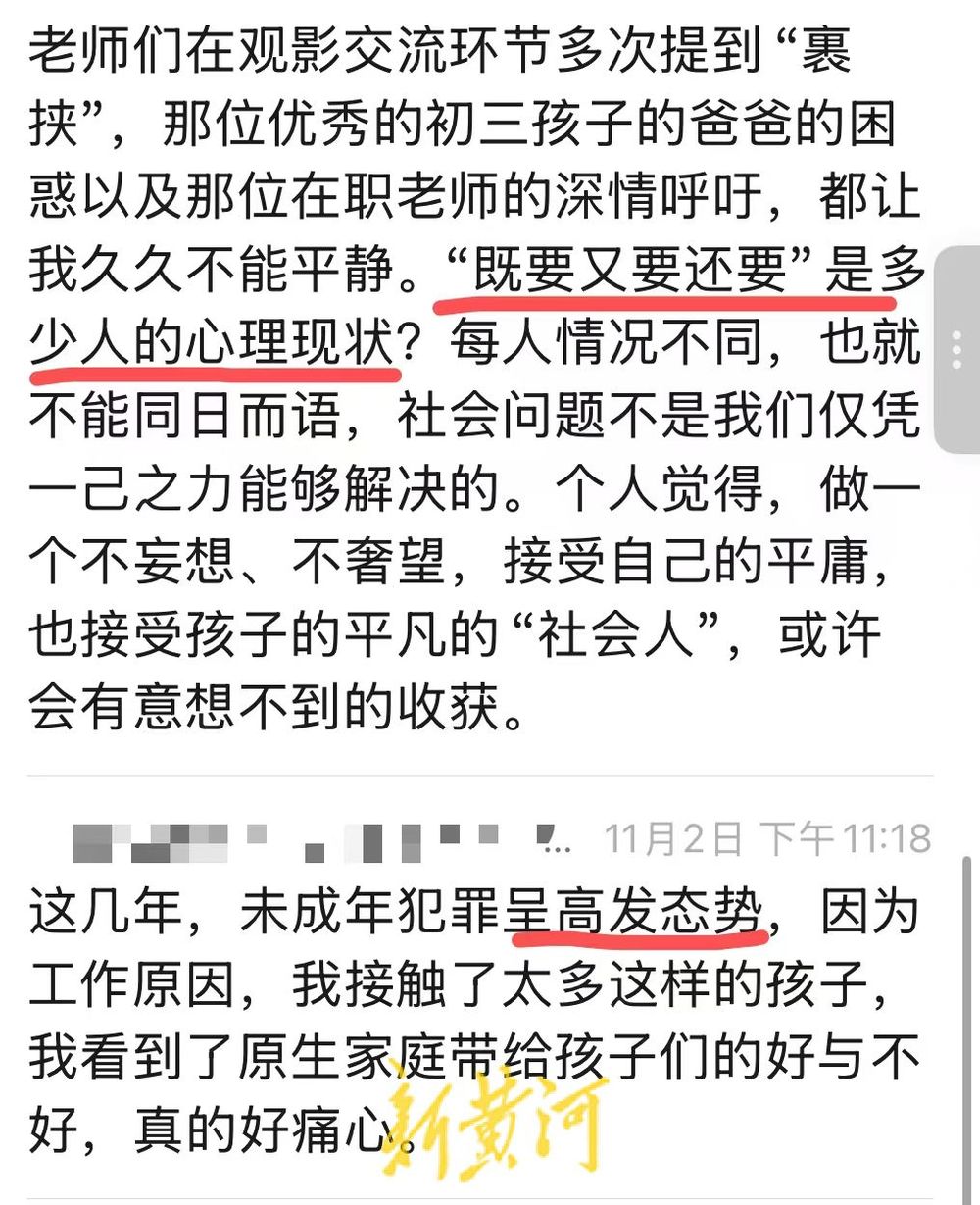 一位家长说:“我们家长经常强调孩子没做到的,却忽视他们已经做到的,这才是对孩子最大的伤害。看完电影我深受触动,要允许孩子做自己,如其所是,而非如我们所愿。”
